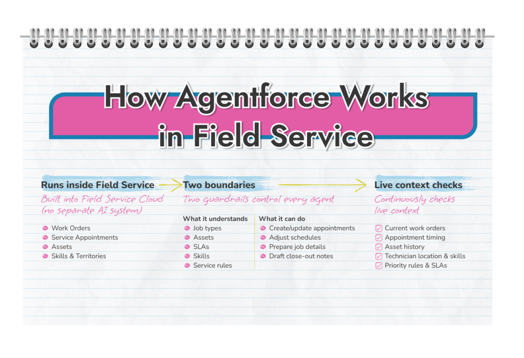 Agentforce for field service is Salesforce adding AI agents directly into Field Service Cloud, so routine work doesn’t keep bouncing back to people. These agents can read live service data, understand what’s happening on a job, and take approved actions when things change.