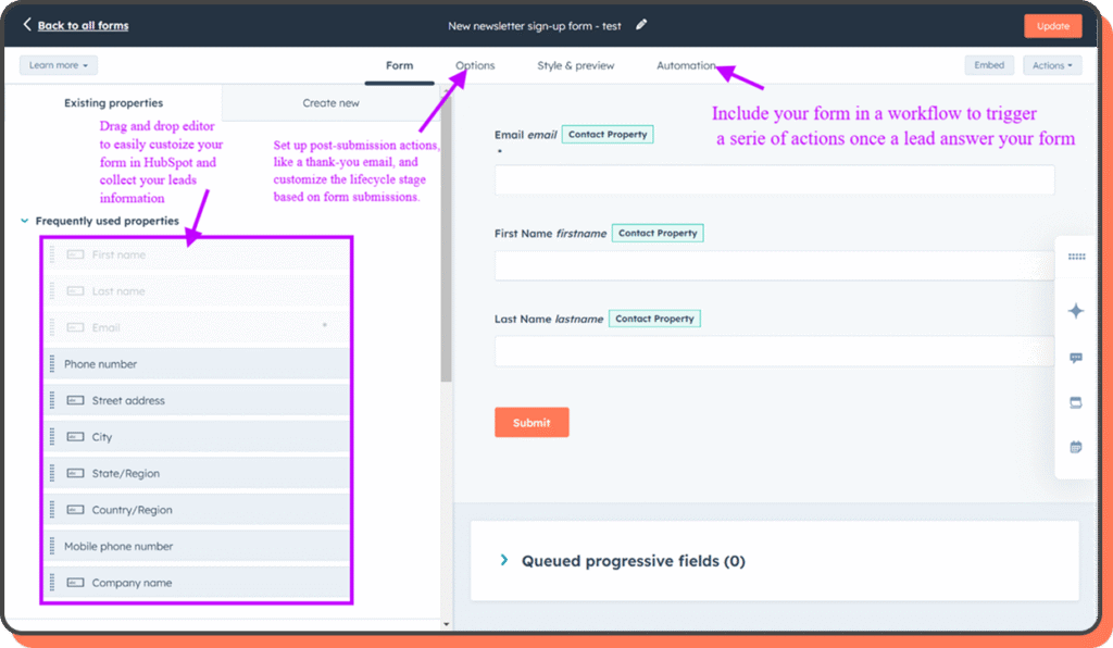 Fewer fields, more completions: Asking for a name, email, and maybe one qualifier beats a 12-question interrogation every time. Progressive profiling in HubSpot CRM lead management lets you gather more information later.