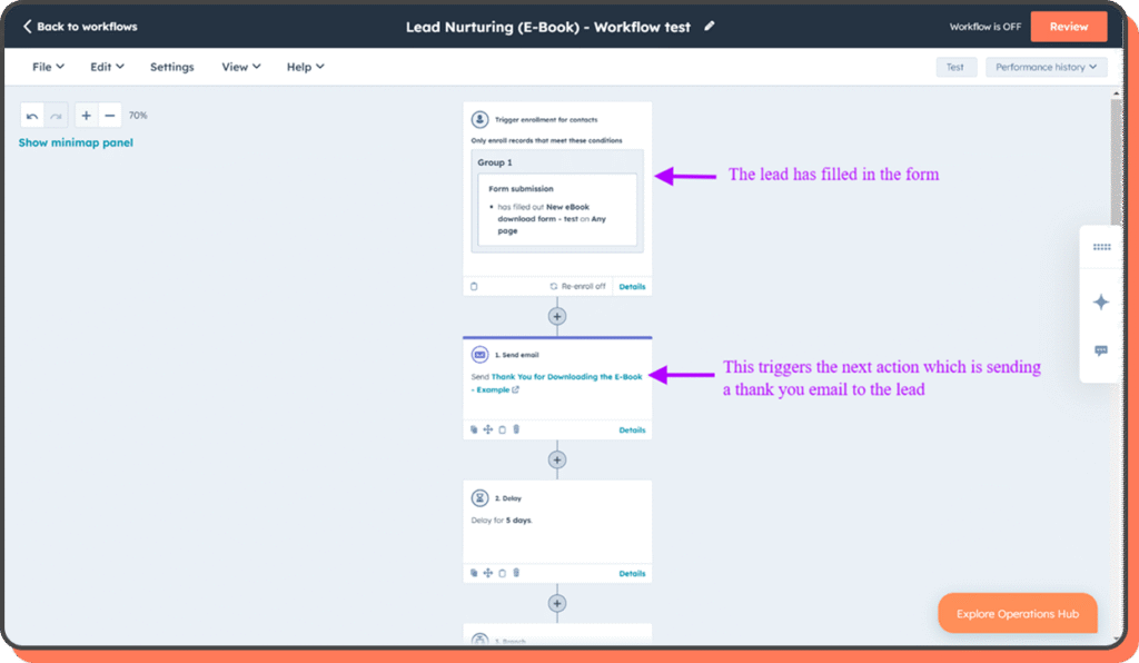 It’s just a set of steps that run on their own. Someone downloads something, an email goes out. Maybe a follow-up two days later. If they click a link? HubSpot can change the next step. It’s all about reacting to what they do.