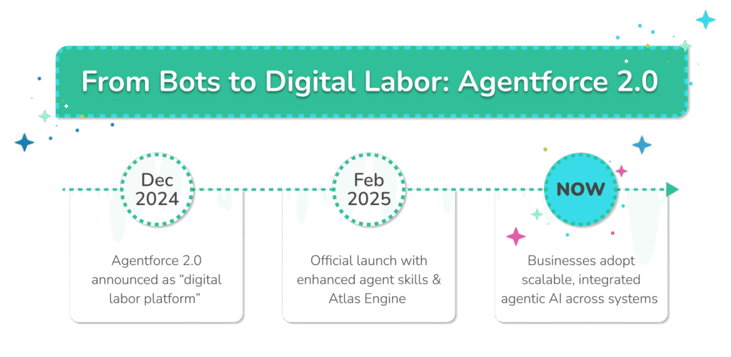 If you’ve checked out our in-depth guide: “What is Salesforce Agentforce?” you already know Agentforce is the ecosystem built by Salesforce to introduce the world to a new era of agentic AI experiences. In December 2024, Salesforce shared its Agentforce 2.0 announcement, describing its updated system as the “digital labor platform for enterprises”.