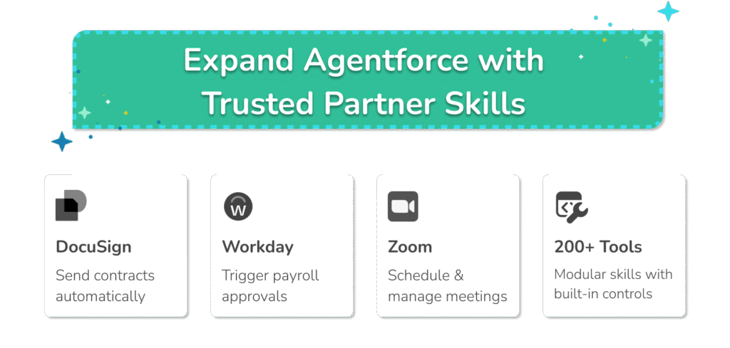 One of the most powerful features of Agentforce 2.0 is its open architecture, which means your agents aren’t limited to Salesforce-only actions. Thanks to AppExchange integrations, you can expand their capabilities using partner-built “skills” that plug into other tools your business already uses.
