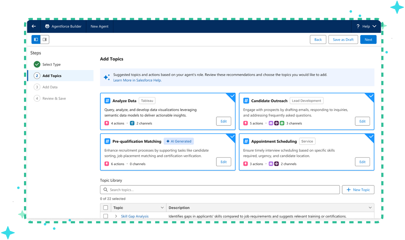 With Agentforce 2.0, you don’t need to build everything from scratch. The platform comes with a growing library of pre-built skills designed for the most common (and time-consuming) business functions, sales follow-ups, support case routing, campaign management, and more.
