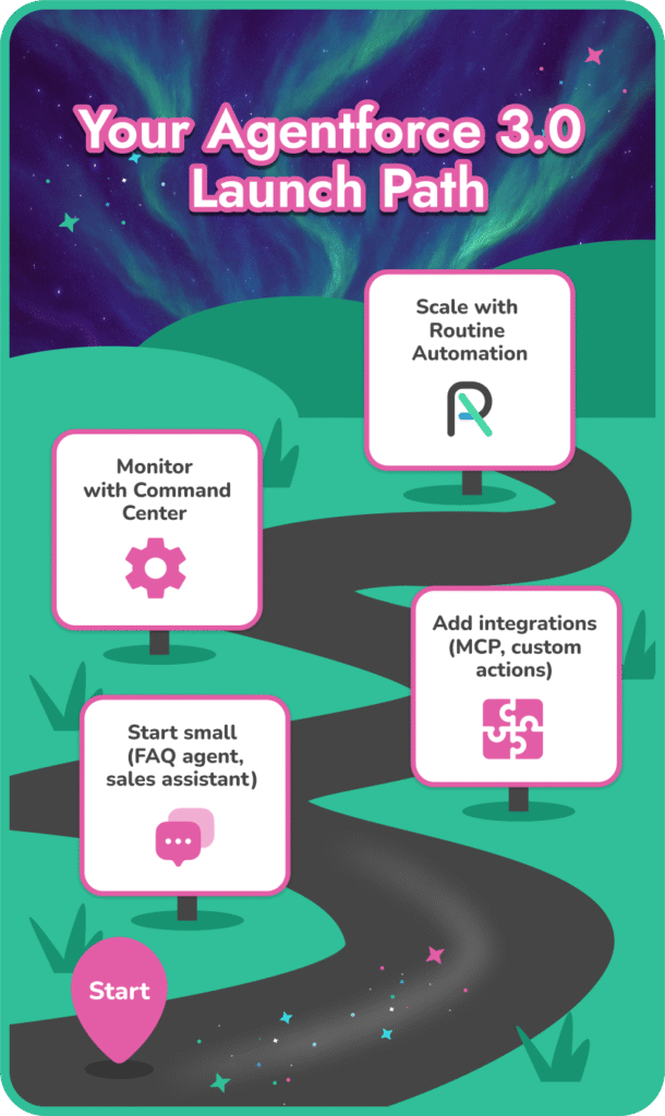You can start small: a single FAQ agent, an internal ticket router, or a sales assistant. Then scale as confidence grows. Salesforce partners, like Routine Automation, are here to help you make the most of the new Salesforce 3.0 experience.