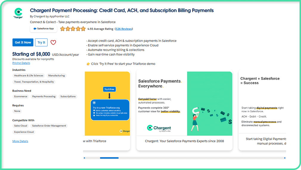 Chargent lets teams collect payments inside Salesforce instead of switching tools. Cards, recurring billing, and collections all fits into the CRM, so the revenue process stays in one place.