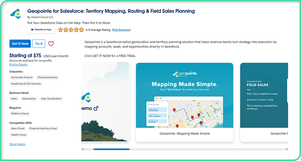 Geopointe turns Salesforce data into maps. Real maps with routes, regions, and visit plans. It helps reps plan smarter trips and gives managers a clearer picture of territory coverage.