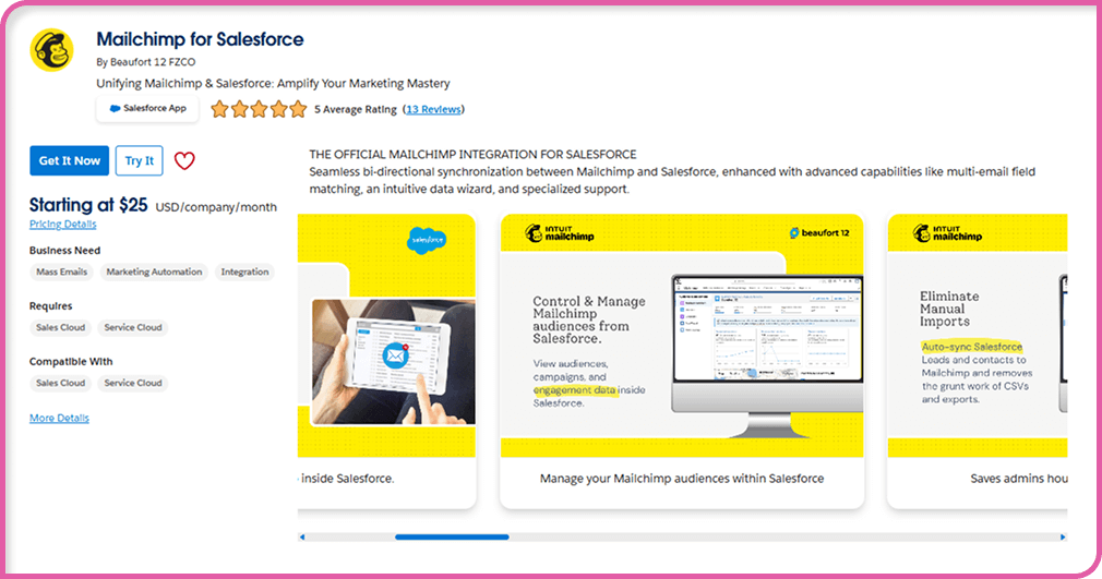 Mailchimp’s connector pulls your Salesforce lists straight into Mailchimp. No exporting. No “which list is correct?” guesswork. When someone opens or clicks an email, that activity comes back into the record so sales isn’t left wondering how a prospect engaged.