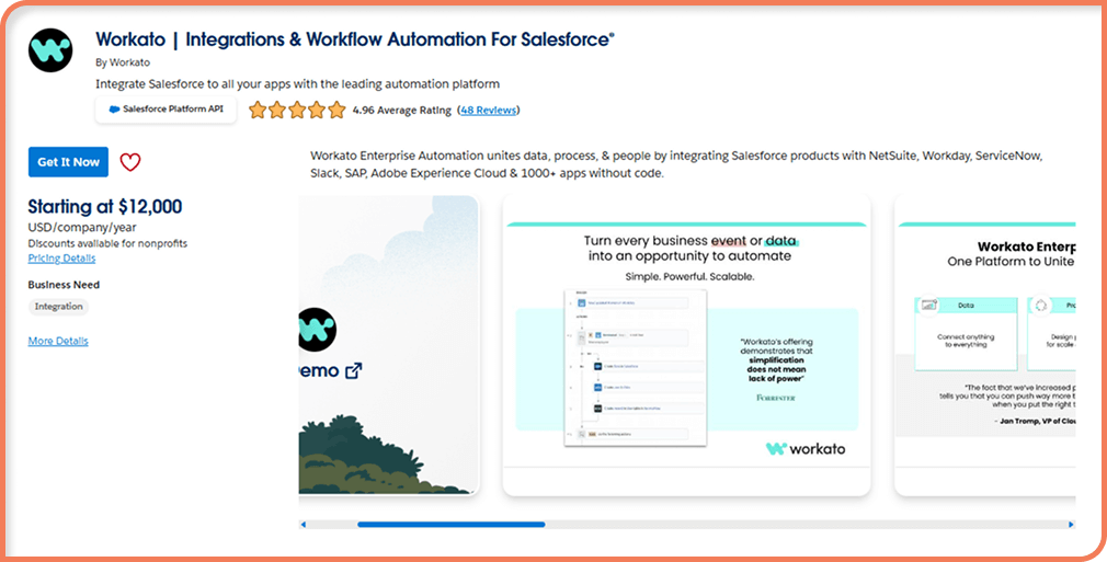 Workato is the Salesforce application people reach for when Zapier starts to feel too small. It handles bigger processes; the ones that stretch across sales, finance, HR, maybe even support. Once it’s running, it stays steady in the background.