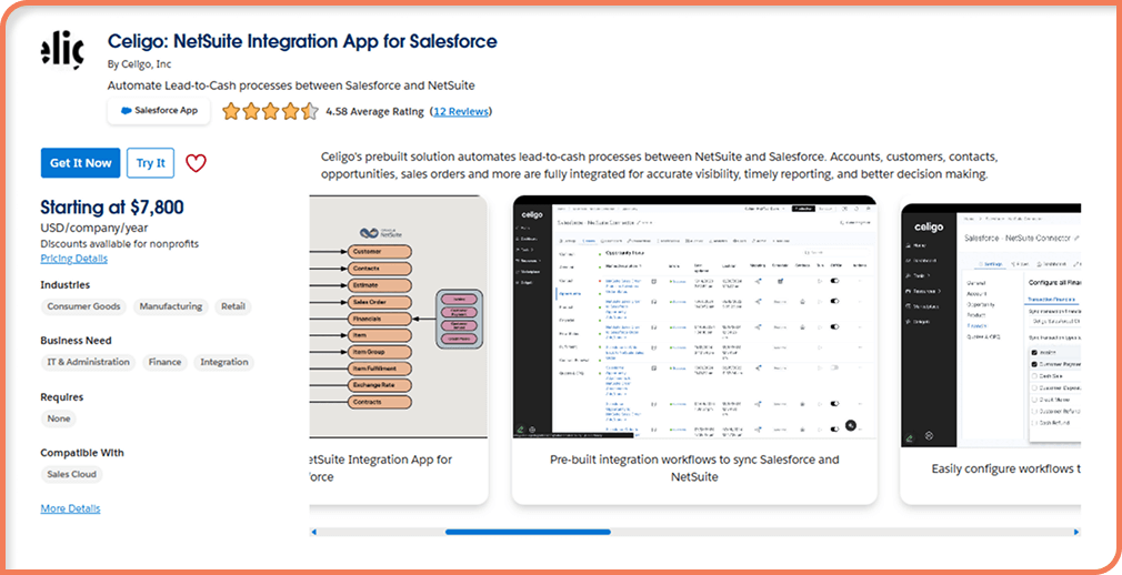 Celigo often shows up in companies with systems like NetSuite or SAP. It keeps Salesforce and those tools aligned so you’re not comparing screenshots or swapping updates at the end of the day.