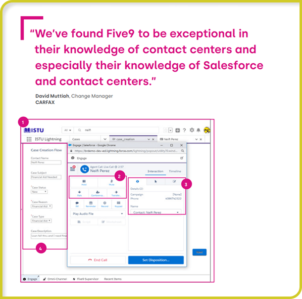 Five9 connects your phone system to Salesforce so reps aren’t switching between screens all day. Incoming calls bring up the right record, and logs get saved without extra steps.