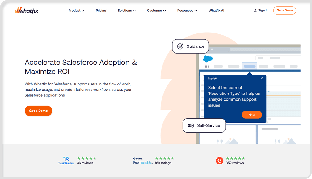 Whatfix shows guidance right inside Salesforce so users don’t need a manual or a training call just to navigate something that changed last week. It cuts down on the “wait, what do I do here?” questions.
