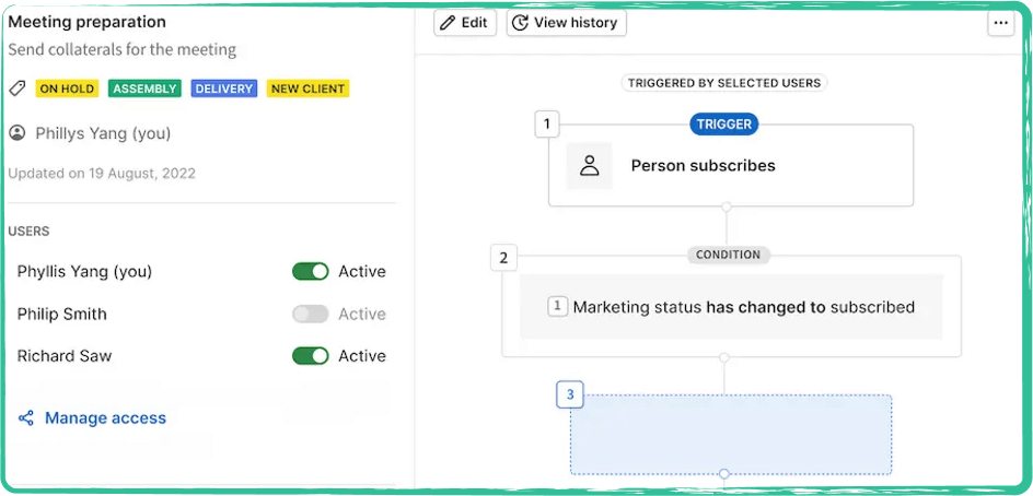 Automation is baked in. You can build simple rules, send a follow-up when a deal hits a stage, assign a task if no activity for five days, stuff like that. It’s not trying to run your business, just clean up the repetitive stuff so you don’t miss anything.