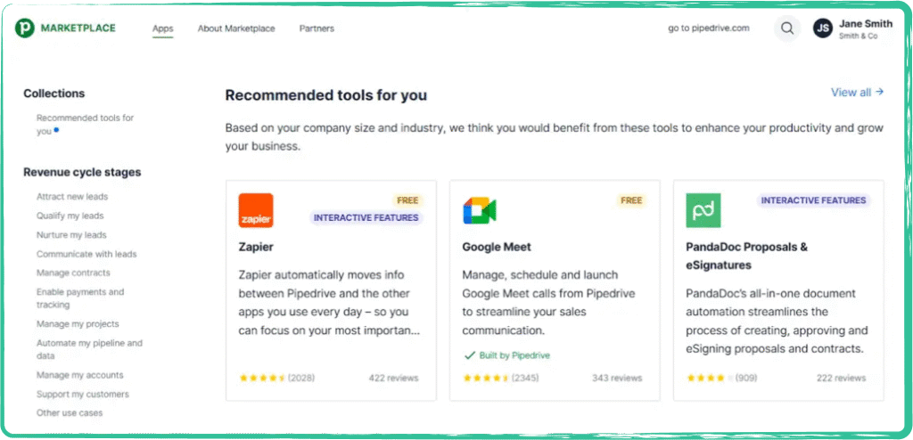 That’s what you get with the Pipedrive CRM system. It connects with over 400 apps: Slack, Zoom, Trello, QuickBooks, Zapier, Mailchimp, Calendly, and a bunch more. You can also use its open API if you’ve got devs on hand. There’s also a bunch of apps to help with sales strategies.