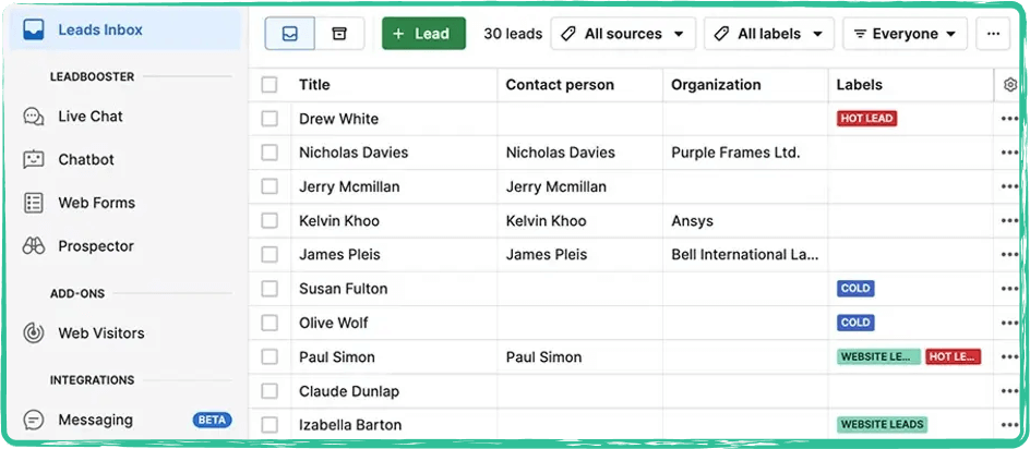 With Pipedrive CRM software, lead capture is built in. Web forms, a live chat tool, and a sales chatbot (called LeadBooster) can all feed leads right into your pipeline.