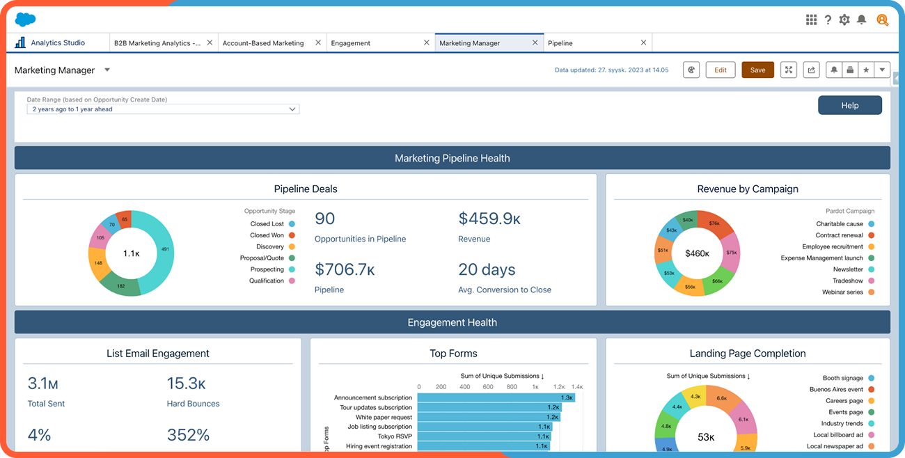 Again, the difference between HubSpot vs Salesforce marketing cloud really stands out here. Salesforce Marketing Cloud gives you raw power in the form of Datorama (now branded as Marketing Cloud Intelligence) and Einstein Analytics. You can draw insights from third-party apps, data lakes, ad platforms, and more. But unless you have a data analyst on staff, a lot of that insight stays locked behind complexity.