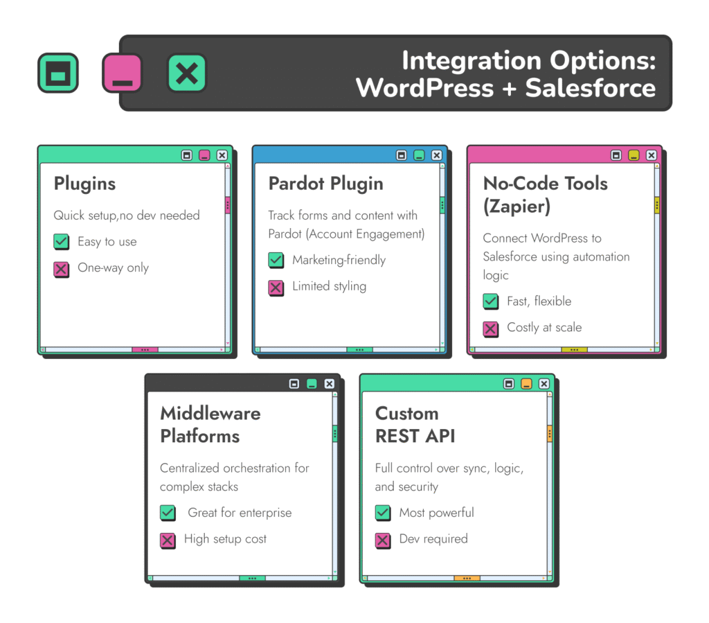 There’s no shortage of ways to connect WordPress with Salesforce, and no shortage of opinions about which one’s best. But here’s the truth: the right method depends entirely on how your team works, what your stack looks like, and how much control you actually want over the process.