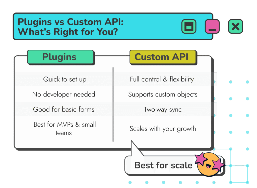 Easier Maintenance: Ironically, custom is often simpler long-term.When you control the code, there’s no surprise update that breaks your integration. No third-party plugin that gets abandoned. No vendor whose pricing triples overnight.If something changes in your sales process, you can adapt your integration.